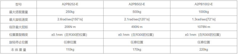 从最小的25kg到最大的1000kg,中间一共6种机型;可通过机器人的示教盒进行操作,可与机器人同时进行示教工作;采用的是AC伺服马达和无背隙减速机,因此可以得到和机器人同样的高精度;与机器人配套使用时,可以实现协调动作(协调软件选购)。
